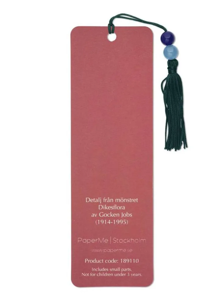 Bokmärke med tofs och två pärlor. Detalj av välkända Gocken Jobs (1914-1995) vackra mönster Dikesflora. Rundade hörn. FSC märkt papper. Kommer i en plastficka.
