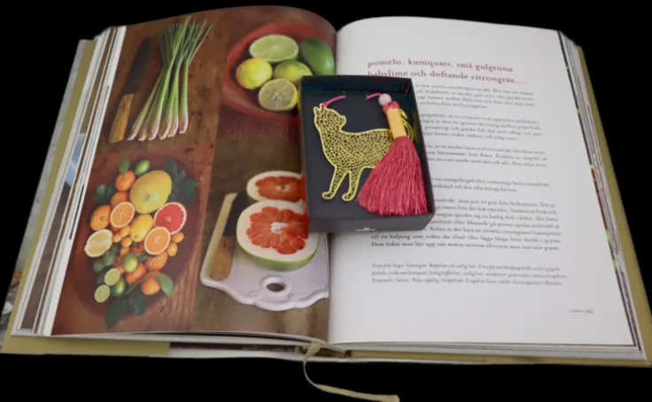 Bokmärke av metall. Det här i form av en katt. Tunna metalltrådar formar designen. Med en fin tofs och dekorativ pärla i rosalila färg. Förpackad i trevlig ask.