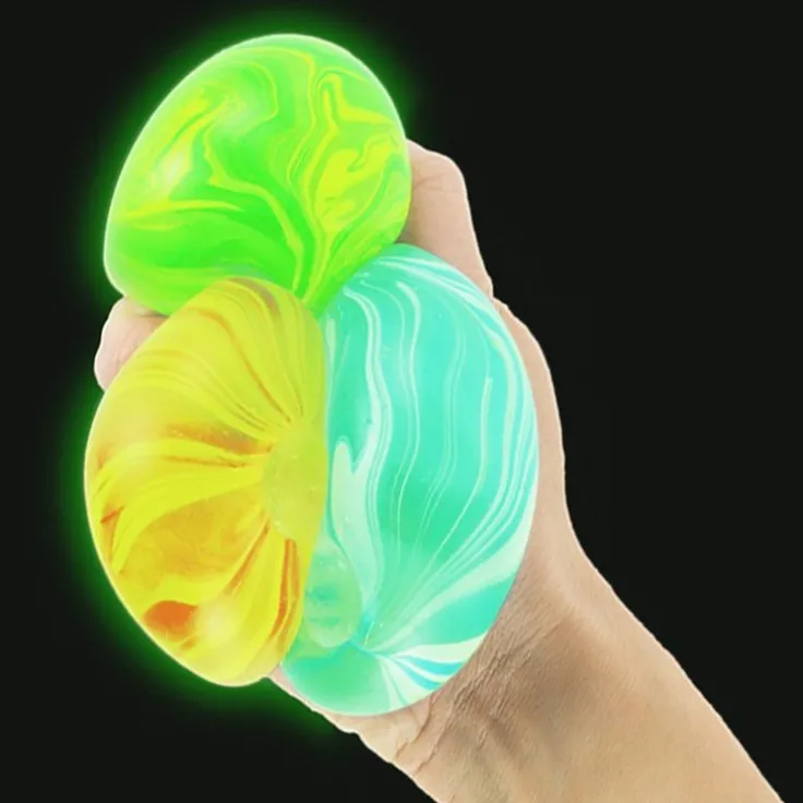 Dessa oemotståndliga och mjukt elastiska anti-stressbollar kan också lysa i mörkret och utlovar en engagerande sensorisk upplevelse vid varje användning! De finns i tre olika färgkombinationer med en fascinerande marmorerad design: antingen blå-vit, röd-gul eller gul-grön. Denna mångsidiga leksak är härligt mjuk och lovar många trivsamma stunder då den lockar dig att dra ut, klämma på och trycka ihop den på olika sätt, vilket även minskar stress och ger ett avkopplande utlopp för bland annat rastlöshet. Om bollen får ligga i ljuset under en tid kan du sedan se den fosforescerande bollen lysa i mörkret och därigenom tillföra en extra dimension till aktiviteten. En perfekt avstressande leksak som erbjuder både taktil utforskning och visuell stimulans i ett!