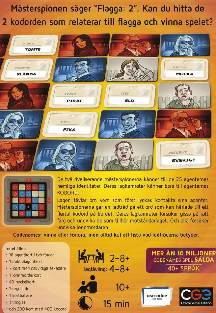I Codenames spelar två lag mot varandra. Varje lag väljer en Spionmästare. Framför alla spelare finns 25 ord upplagda. Vissa ord tillhör till det ena laget och några det andra laget. Bara Spionmästaren vet vilka ord som tillhör vilket lag. Spionmästaren ska nu komma på en ledtråd som består av ett ord och ett nummer. Numret säger hur många av de 25 upplagda orden som ledtråden refererar till. Codenames är ett ord associationsspel. Laget ska sätta sig i Spionmästarens ställe. Vad tänker Spionmästaren på när hen kommer på en ledtråd? Ju bättre man känner sitt lag, desto enklare är det att komma på en ledtråd.