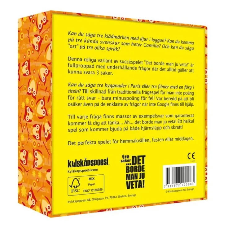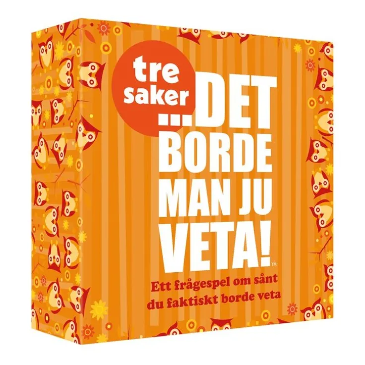 Kan du säga tre klädmärken men djur i sin logga? Tre filmer men en färg i titeln? Och kan du komma på tre kända svenskar som heter Camilla?Denna roliga variant av succéspelet ”Det borde man ju veta!” är fullproppad med medryckande och underhållande frågor där det alltid gäller att kunna svara 3 saker. Ett kul spel som kommer bjuda på både hjärnsläpp och skratt!Till varje fråga finns massor av exempelsvar som garanterat kommer få dig att tänka… Ah… det borde man ju veta! Till skillnad från traditionella frågespel får man inte poäng för rätt svar – bara minuspoäng för fel! Ju enklare fråga – desto fler minuspoäng. Kan du säga tre kända byggnader i Paris, som inte är Eiffeltornet? Tre kända idrottare från Norge? Och kan du säga”ost” på tre andra språk?Var beredd på att bli osäker även på de enklaste av frågor när inte Google finns till hjälp! Perfekt för festen, middagen eller med familj och vänner!