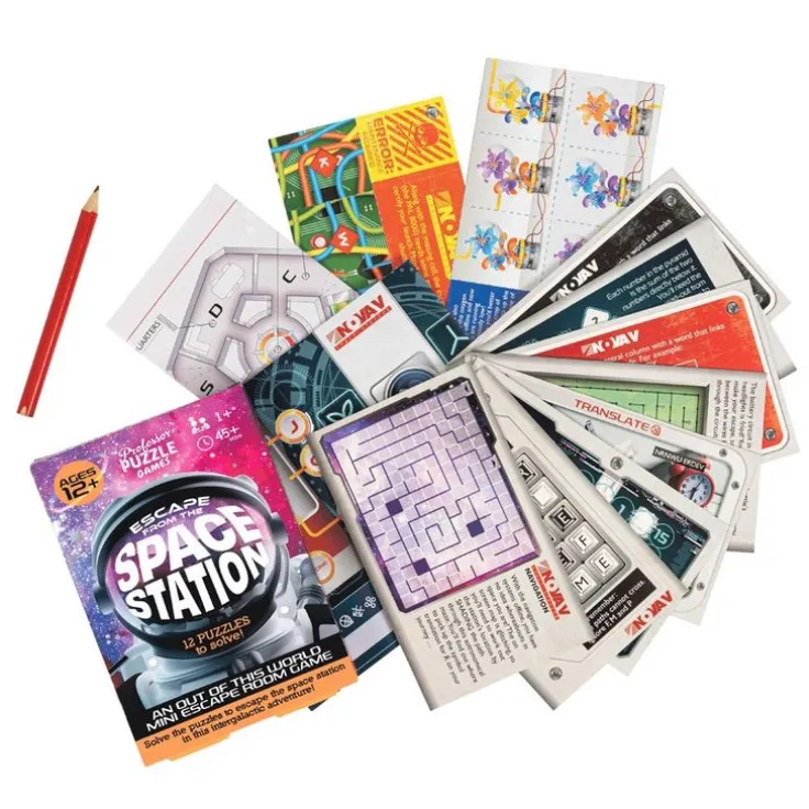 Ett mini escape room-spel utom denna värld … Det är inte varje dag du blir instängd på en rymdstation som rusar mot ett asteroidbälte. Och när stationen kastas ur kurs finns det ingen tid för panik! Ditt enda skott på säkerhet ligger med en lapp skriven med ett konstigt språk – det ser ut som om du måste ta på dig din intergalaktiska tankemössa! Det finns 12 olika pussel, från knepiga bildpussel till galna labyrinter, och lösningen för var och en kommer att översätta en enda bokstav på lappen. Först när alla 12 pussel har lösts korrekt och sedeln har avkodats, kommer du att kunna fly från rymdstationen!