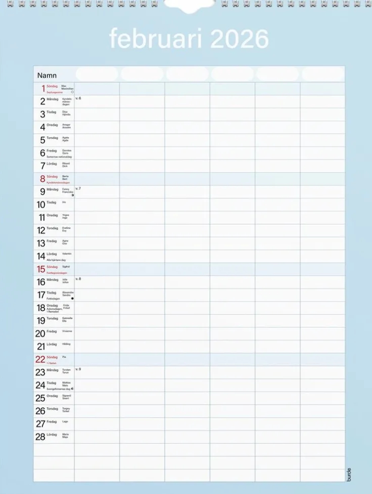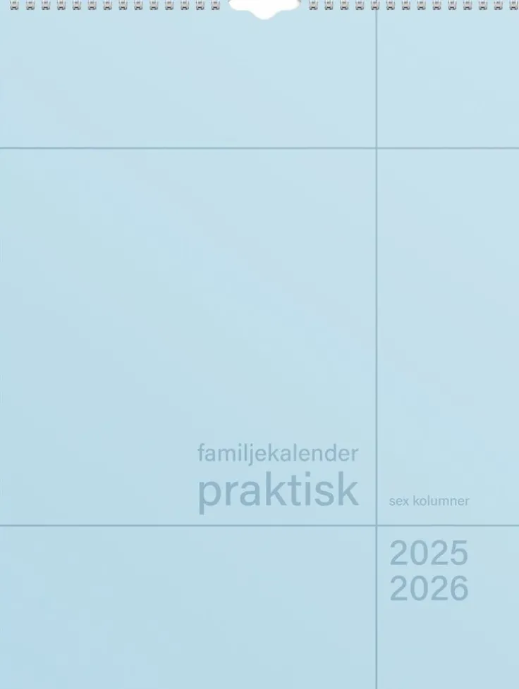En neutral praktisk familjekalender att hänga på väggen. Kalendern har sex kolumner som passar den stora familjen eller för er som vill ha en möjlighet att planera det där lilla extra för att få ihop ert livspussel. Använd exempelvis de extra kolumnerna till att planera in måltider eller födelsedagar. Familjekalender 25/26 från Burde. Format: 295×390 mm. Layout: Månad/blad. Kalendarium: 2025-07-01 – 2026-06-30. Spiralbunden. Innehåll: 6 kolumner. Antal sidor: 12. Miljöinformation: FSC®.
