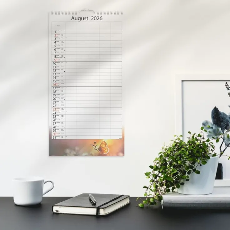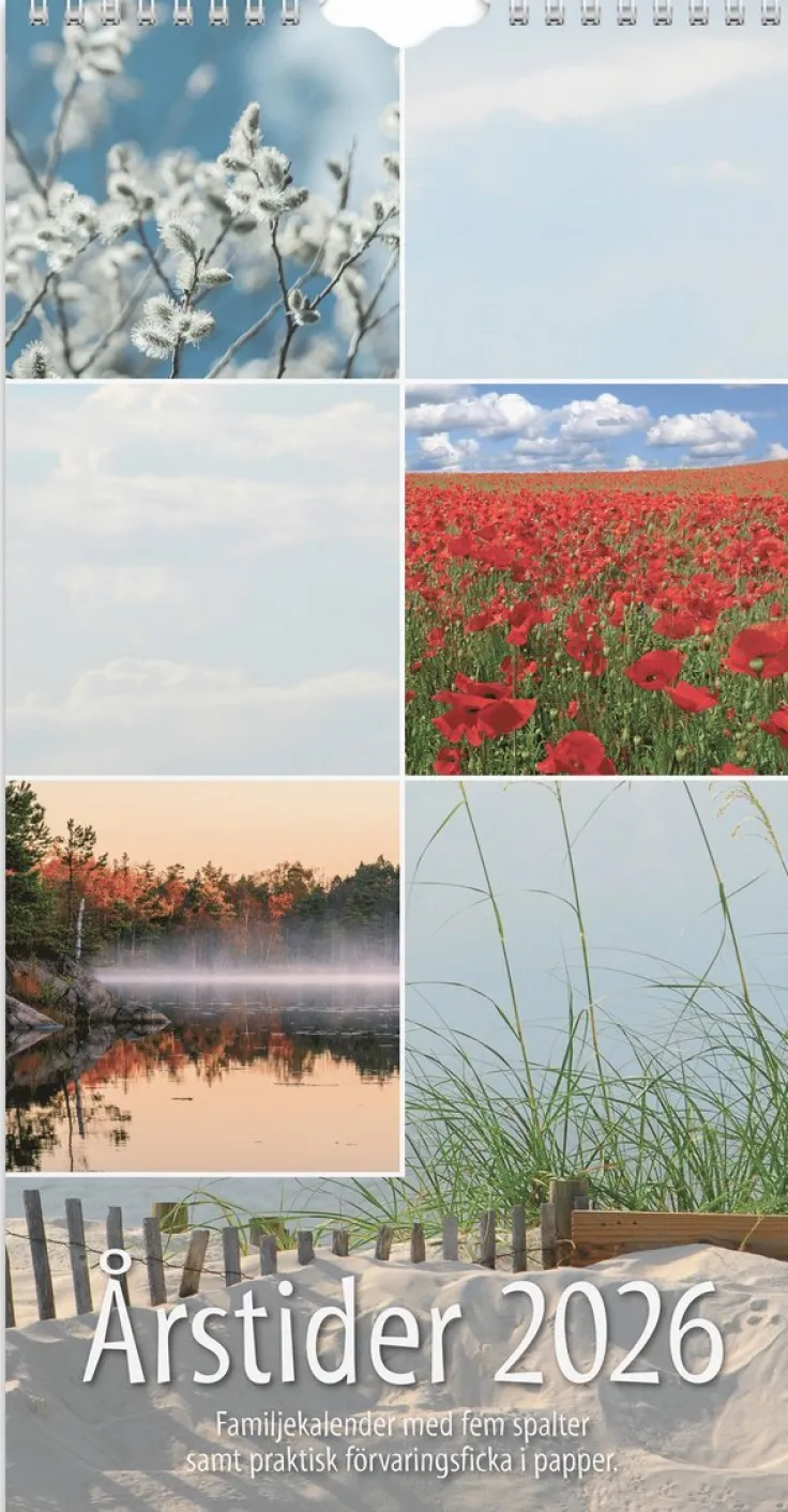 Klassisk familjekalender med 5 kolumner och fina årstidsbilder. Väggkalendern har en praktisk ficka för lösa papper.Familjekalender 2026 från Burde. Format: 220×430 mm. Layout: Månad/blad. Kalendarium: 2026-01-01 – 2026-12-31. Spiralbunden. Detaljer: Pappersficka. Innehåll: 5 kolumner, Kyrkliga helgdagar, Flaggdagar, Helgdagar/aftnar, Månfaser, Namnsdagar, Temadagar/händelser. Antal sidor: 12. Miljöinformation: FSC®. Klimatkompenserad.
