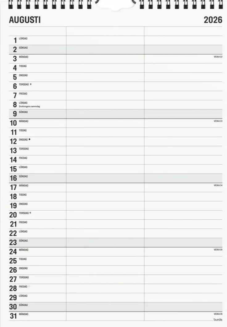 Ordning och reda bland bio, helgsysslor och utvecklingssamtal. Kom ihåg alla viktiga aktiviteter med en familjekalender. Denna har 2 kolumner för den mindre familjen eller för paret, lättplacerad tack vare sina neutrala färgsättning.>Familjekalender 2026 från Burde. Format: A4. Layout: Månad/blad. Kalendarium: 2026-01-01 – 2026-12-31. Spiralbunden. Innehåll: Helgdagar/aftnar, månfaser, temadagar/händelser, 2 kolumner. Antal sidor: 12. Miljöinformation: FSC®.