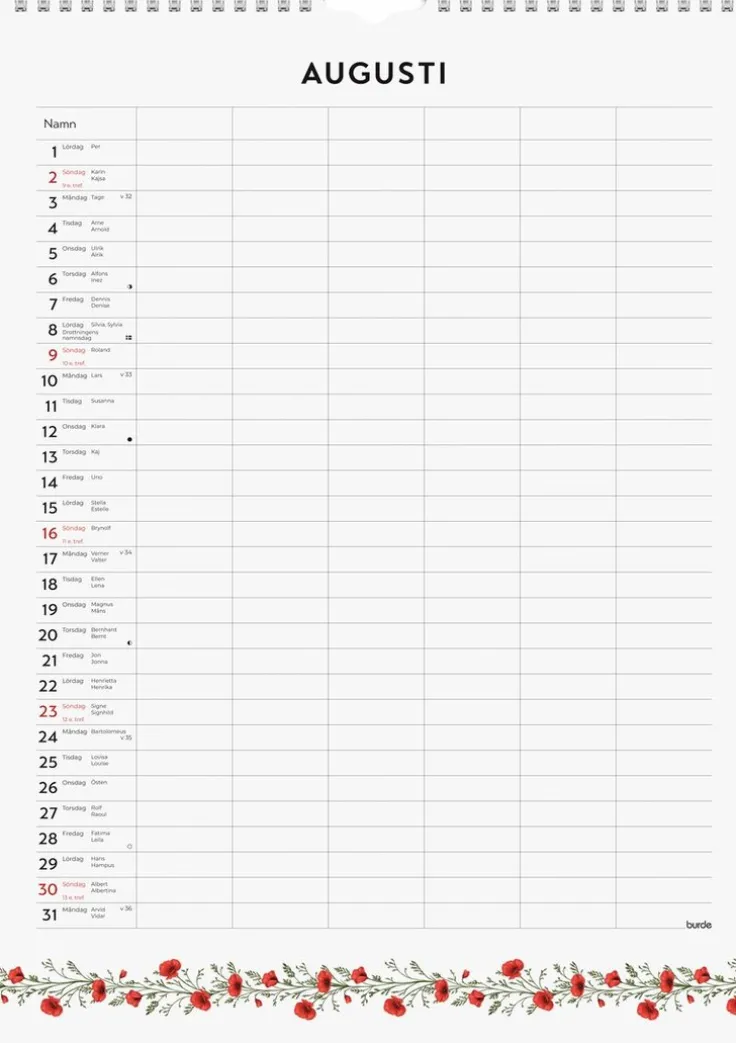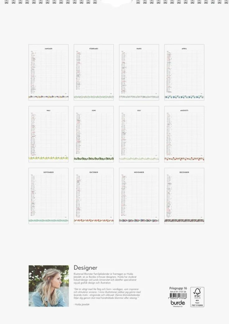 Familjekalender 2026 från Burde. Format: A3. Layout: Månad/blad. Kalendarium: 2026-01-01 – 2026-12-31. Spiralbunden. Innehåll: Kyrkliga helgdagar, flaggdagar, helgdagar/aftnar, månfaser, namnsdagar, temadagar/händelser, årsöversikt/årsöversikter, 6 kolumner. Antal sidor: 12. Miljöinformation: FSC®.