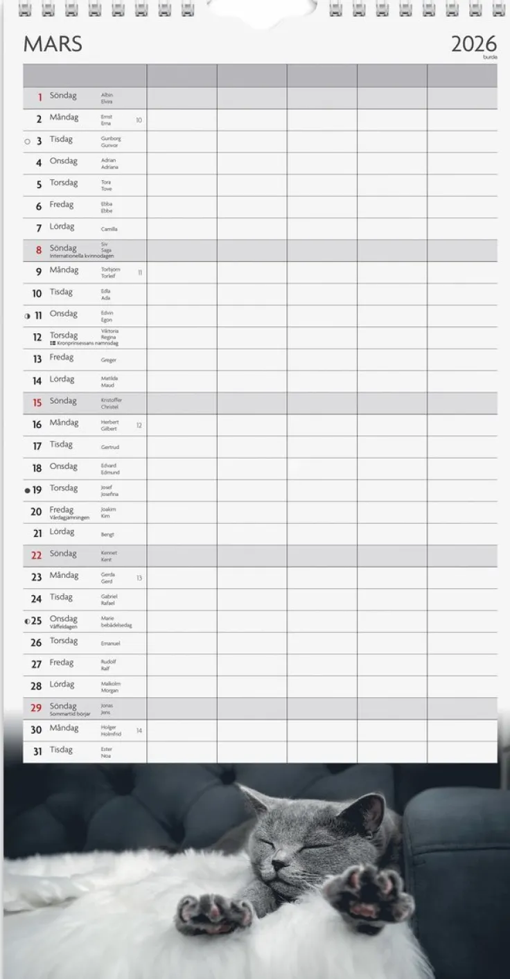 En väggkalender med fem kolumner för familjeplanering. Månadsuppslag med kattmotiv.>Familjekalender 2026 från Burde. Format: 220×430 mm. Layout: Månad/blad. Kalendarium: 2026-01-01 – 2026-12-31. Spiralbunden. Detaljer: Pappersficka. Innehåll: Flaggdagar, helgdagar/aftnar, månfaser, namnsdagar, temadagar/händelser,. Antal sidor: 12. Miljöinformation: FSC®.