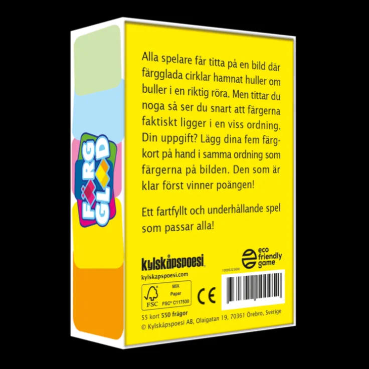 I Färgglad har alla spelare fem färgkort på handen. Och det är korten som är nyckeln till framgång!Lägg fram ett av de färgglada ”huller om buller”-korten, där samma fem färger som du har på handen ligger i en riktig röra. Men tittar du noga så ser du snart att färgerna faktiskt ligger i en viss ordning – den ena på den andra och så vidare.Din uppgift? Att ordna dina fem kort på handen i samma ordning som färgerna på bilden – och så snabbt som möjligt! Utmana familj och vänner och var beredd på många skratt!