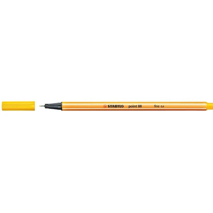 STABILO point 88 fineliner. Det är den enda finelinern som finns i så många som 47 olika färger. Skrivspetsen är metallomsluten för en längre livslängd för pennan. Med STABILO point 88 skrivs tunna fina linjer utan risk för att färgen smetas ut. Pennan är sexkantigt utformad med en lång ”cap off” tid och ventilerad huv och har en pennspets på 0,4 mm.