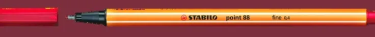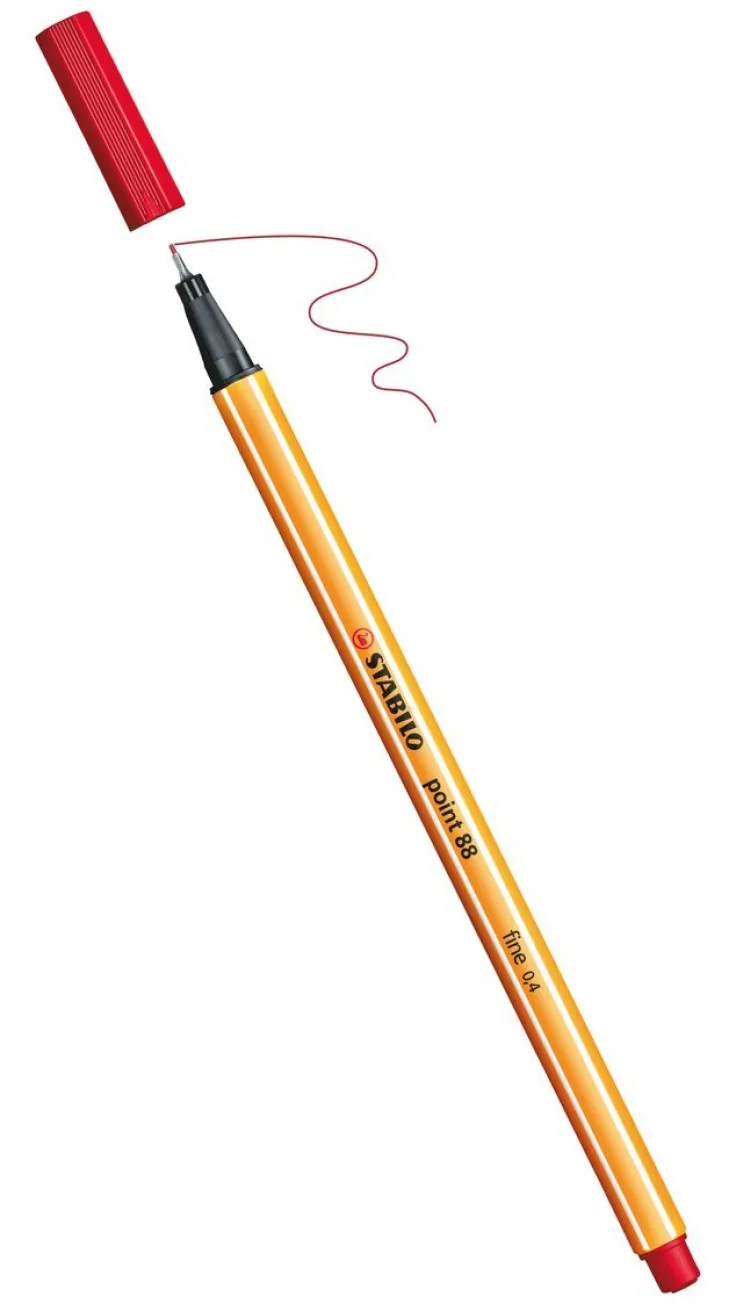 STABILO point 88 fineliner. Det är den enda finelinern som finns i så många som 47 olika färger. Skrivspetsen är metallomsluten för en längre livslängd för pennan. Med STABILO point 88 skrivs tunna fina linjer utan risk för att färgen smetas ut. Pennan är sexkantigt utformad med en lång ”cap off” tid och ventilerad huv och har en pennspets på 0,4 mm.