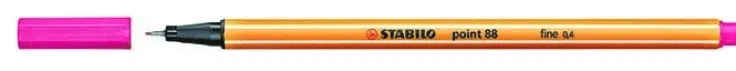 STABILO point 88 fineliner. Det är den enda finelinern som finns i så många som 47 olika färger. Skrivspetsen är metallomsluten för en längre livslängd för pennan. Med STABILO point 88 skrivs tunna fina linjer utan risk för att färgen smetas ut. Pennan är sexkantigt utformad med en lång ”cap off” tid och ventilerad huv och har en pennspets på 0,4 mm.