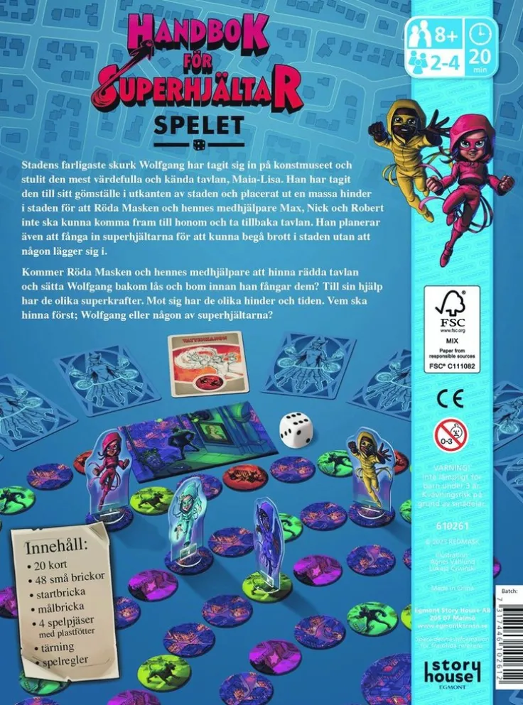 Handbok för superhjältar är ett sällskapsspel för hela familjen, från 8 år. Superhjältarna tar hjälp av olika superkrafter för att fånga in stadens farligaste skruk, eller hinner skurken fånga in superhjältarna först?