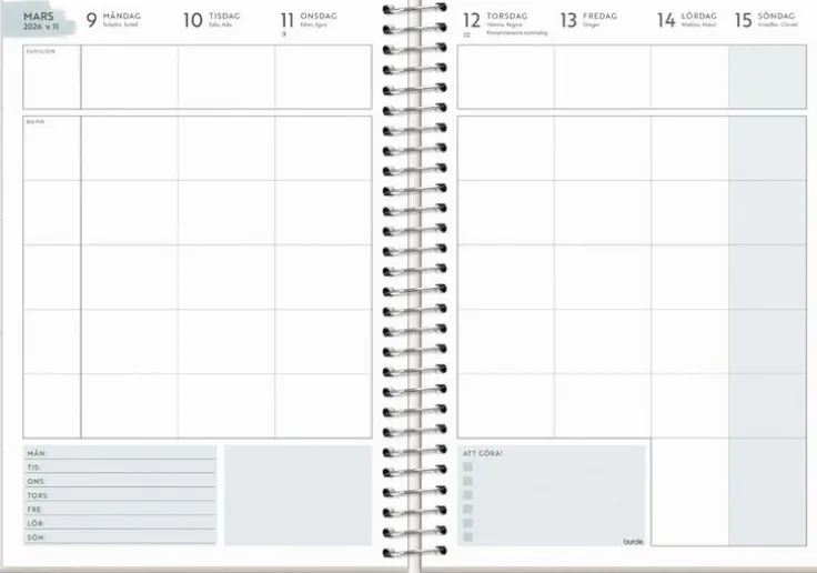 Familjelivet gjort enkelt! Att hålla reda på vad alla i familjen gör varje dag är inte en enkel uppgift. Med Life Organizer Family får du nyckeln som kan hjälpa dig organisera alla måsten, aktiviteter och kom ihåg. I ett stilrent och neutralt omslag är kalendern utformad med sidor som innehåller check-listor, familjens mål och tydliga uppslag för både veckor och månader med plats för att skriva ner varje familjemedlems aktiviteter. Tre stycken stickersark ingår.Kalender 25/26 från Burde. Format: A5. Layout: Stående. Vecka/uppslag. Kalendarium: 2025-06-23 – 2026-06-28. Omslag: Kartong med struktur. Spiralbunden. Detaljer: Pappersficka. Innehåll: Checklistor, Familjens mål, Månadens mål, Månadsöversikt, Anteckningssidor, Stickersark, To-do, Trackers, Årsöversikter, Årsplan. Antal sidor: 176. Miljöinformation: FSC®.