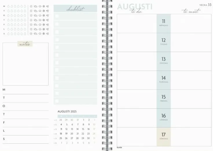 För att uppnå en effektiv vardag krävs det bra planering. Kartlägg dina rutiner och få en bra struktur med hjälp av tydlig veckoplanering. Life Planner To Do är det ultimata verktyget som hjälper dig att få saker gjorda och även hålla kolla på ditt liv i nutid såväl som i framtid. Med praktiska to-do listor och trackers i kombination med veckouppslagen får du extra möjlighet att organisera och strukturera ditt liv på ett tankfullt sätt.Kalender 25/26 från Burde. Format: A5. Layout: Liggande. Vecka/uppslag. Kalendarium: 2025-06-09 – 2026-06-28. Omslag: Kartong. Spiralbunden. Detaljer: Gummiband. Flyttbar plastlinjal. Pappersficka. Innehåll: Månadsöversikt, Anteckningssidor prickade, Anteckningssidor linjerade, Planeringslistor, Årsöversikter, Årsplan. Antal sidor: 160. Miljöinformation: FSC®.