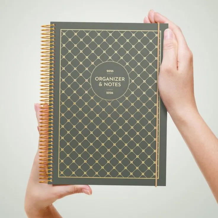En kalender och anteckningsbok i ett! Första halvan innehåller ett kalendarium med vertikal veckolayout, medan andra halvan är linjerade sidor för dina listor och anteckningar. Med hjälp av de flyttbara flikarna förflyttar du dig smidigt mellan veckoplanering och anteckningar. Perfekt som komplement till digital planering. Kalendern har en vacker grön kulör med stilrena dekorationer i guld.Kalender 25/26 från Burde. Format: A5. Layout: Stående. Vecka/uppslag. Kalendarium: 2025-06-02 – 2026-07-12. Omslag: Kartong med struktur. Spiralbunden. Detaljer: Gummiband. Flyttbara plastmarkörer. Innehåll: Anteckningssidor, Årsöversikter, Årsplaner. Antal sidor: 256. Miljöinformation: FSC®.