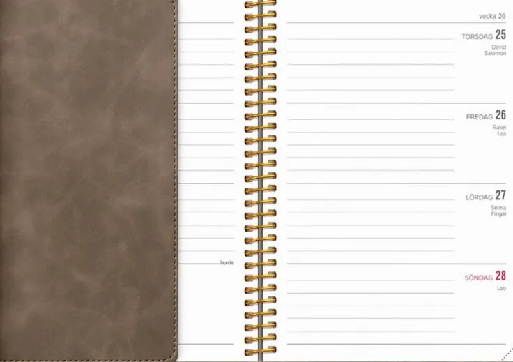 Senator A6 har en klassiskt liggande layout där fokus ligger på en enkel veckoplanering. Med årsöversikt och månadsplanering blir senator A6 ett perfekt verktyg för dig som har mycket på gång eller som ett analogt komplement till dina tekniska lösningar. Check-listor och mindre anteckningsmöjligheter ingår också, liksom en praktisk förvaringsficka. Kommer även i ett större A5 format.Omslaget Twist Mocca är i en sammetsmjuk skinnimitation med en användbar flärp som kan fungera som bokmärke för att enkelt förflytta dig i kalendern. Kalender 25/26 från Burde. Format: A6. Layout: Liggande. Vecka/uppslag. Kalendarium: 2025-06-02 – 2026-07-05. Omslag: Konstläder. Spiralbunden. Innehåll: Årsöversikter, Årsplaner. Antal sidor: 144. Miljöinformation: FSC® papper.