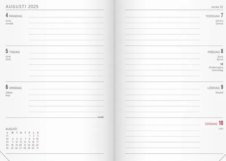 Senator A6 har ett klassiskt veckouppslag med liggande layout. Fokus ligger på en enkel veckoplanering. Med årsöversikt och årsplanering blir senator A5 ett perfekt verktyg för dig som har mycket på gång eller som ett analogt komplement till dina tekniska lösningar. Check-listor och mindre anteckningsmöjligheter ingår också liksom en praktisk förvaringsficka. Kommer även i ett större A5-format. Omslaget Vega i svart skinnimitation ger en klassisk look till en traditionell kalender.Kalender 25/26 från Burde. Format: A6. Layout: Liggande. Vecka/uppslag. Kalendarium: 2025-06-02 – 2026-07-05. Omslag: Konstläder. Inbunden. Detaljer: Gummiband. Märkband. Innehåll: Årsöversikter, Årsplaner. Antal sidor: 144. Miljöinformation: FSC®.