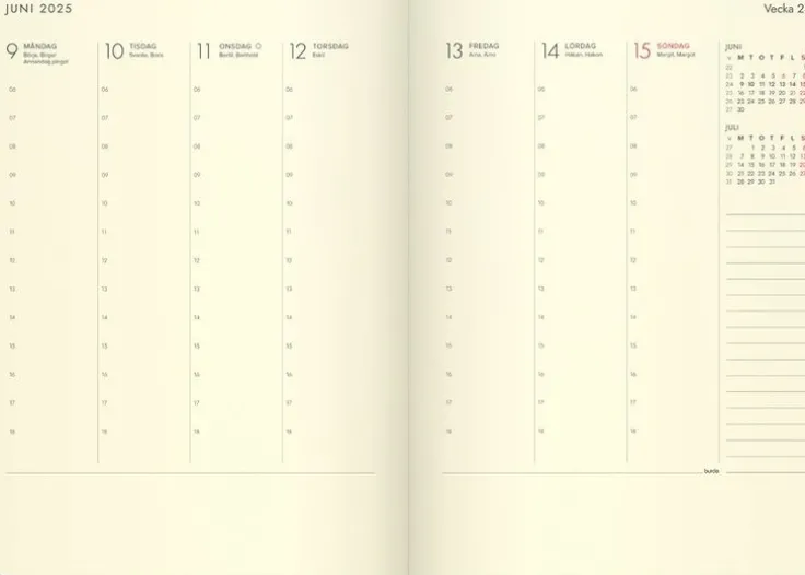 En stilren, exklusiv inbunden kalender med cremefärgat papper. Den ligger plant på bordsytan när du skriver tack vare bindningstekniken som tillåter kalendern att öppnas upp helt vid användning. Kalendern har en vecka per uppslag, en stående layout med timindelning 06-18, samt anteckningsyta längst ner på uppslaget för kom-ihåg eller reflektioner. Innehåller en lättöverskådlig årsplanering samt 64 sidor för anteckningar.Kalender 2025 från Burde. Format: A5. Layout: Stående. Vecka/uppslag. Timindelning 6-18. Kalendarium: 2024-12-23 – 2026-01-04. Omslag: Konstläder. Inbunden. Detaljer: Gummiband. Märkband. Pappersficka. Innehåll: Årsplaner, 26 Linjerade sidor med datumrad, 6 sidor med rutor med datumrad, 32 Olinjerade sidor med datumrad. Antal sidor: 176. Miljöinformation: FSC® papper.