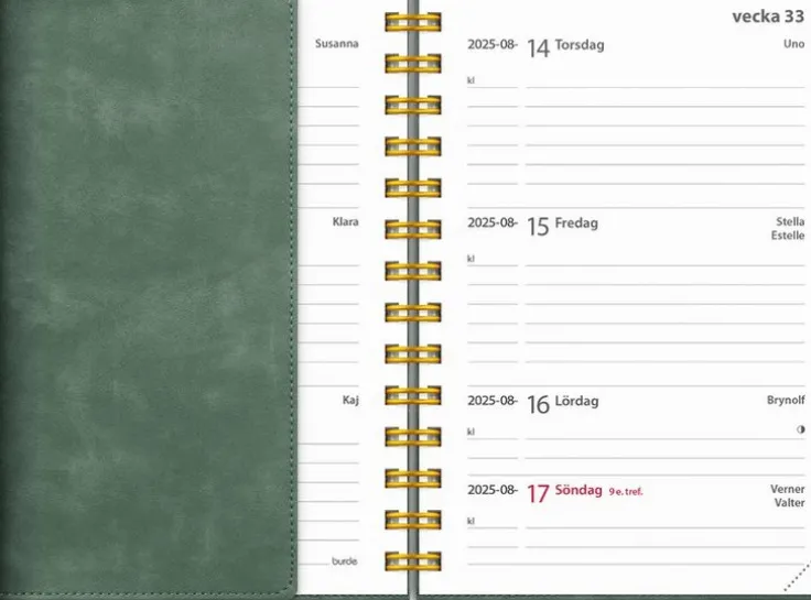 Kalender med mjuk pärm i konstläder med den populära flärpen som kan användas som bokmärke. Den lilla praktiska veckokalendern!Kalender 2025 från Burde. Format: 82×127 mm. Layout: Liggande. Vecka/uppslag. Kalendarium: 2024-12-16 – 2026-01-04. Omslag: Konstläder. Spiralbunden. Innehåll: Årsöversikter, årsplaner, atlas. Antal sidor: 128. Miljöinformation: FSC® papper.