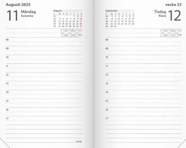 Kalender 2025 från Burde. Format: 79×127 mm. Layout: Dag/sida. Timindelning 08-17. Kalendarium: 2025-01-01 – 2026-01-01. Omslag: Konstläder. Inbunden. Innehåll: Årsöversikter, årsplaner. Antal sidor: 384. Miljöinformation: FSC®.