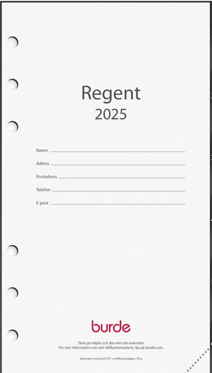 Grundsats till systemkalender Regent. Kalenderdelen innehåller hålad kalenderdel (4601) och blankettdel.Kalender 2025 från Burde. Format: 95×170 mm. Layout: Liggande. Vecka/uppslag. Timindelning 8-17. Kalendarium: 2024-10-28 – 2026-01-25. Omslag: Kartong. Detaljer: Flyttbar linjal. Innehåll: Årsöversikt, årsplaner, blankettdel med motion, kassabok, att göra, körjournal, projekt, budget, anteckningar, telefonregister. Linjal, register standard, register A-Ö. Antal sidor: 240. Miljöinformation: FSC®.