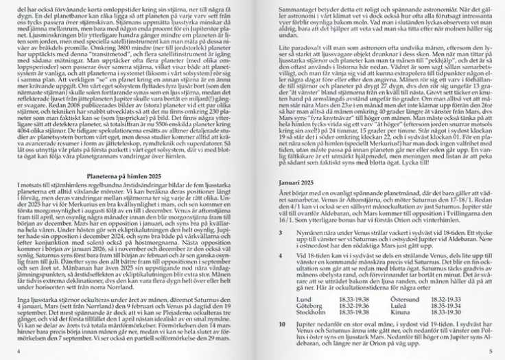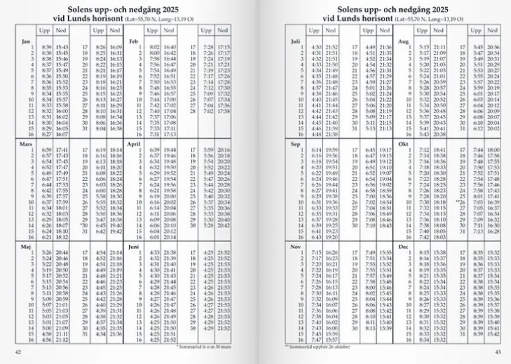 Kalender där du kan följa solens och månens upp- och nedgång varje dag vid sex olika horisonter. Den innehåller fakta om planeterna på himlen för varje månad och blandade uppgifter om Sverige.Kalender 2025 från Burde. Format: A6. Layout: Månad/uppslag. Kalendarium: 2025-01-01 – 2025-12-31. Omslag: Kartong. Häftad. Innehåll: Årsöversikter. Antal sidor: 80. Miljöinformation: FSC®.
