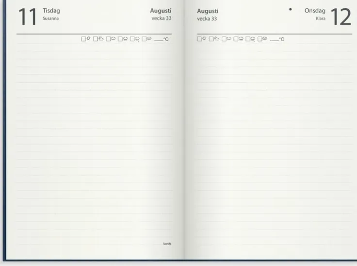 Cremefärgat papper. Namnsdagsregister och plats för vädernoteringar.>Kalender 2026 från Burde. Format: 142×205 mm. Layout: Dag/sida. Kalendarium: 2026-01-01 – 2026-12-31. Omslag: Konstläder. Inbunden. Detaljer: Märkband. Innehåll: Kyrkliga helgdagar, flaggdagar, helgdagar/aftnar, månfaser, namnsdagar, temadagar/händelser, årsöversikt/årsöversikter, årsplan/årsplaner, vädernoteringar. Antal sidor: 384.