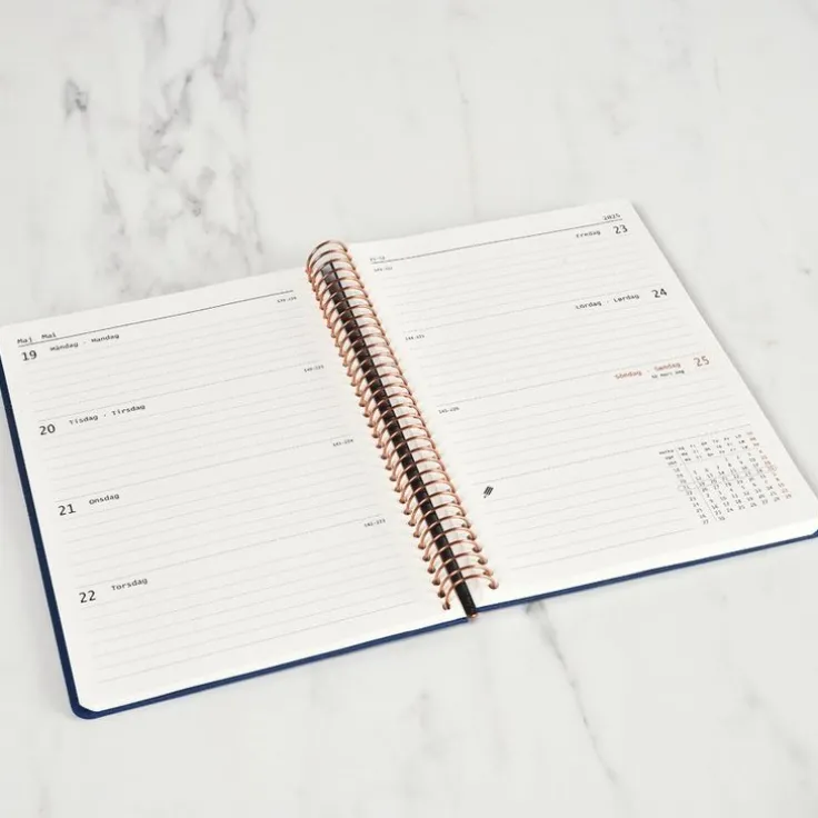 KOZO Planner 2025 är en stilren, trespråkig årskalender som är perfekt för att organisera både jobb, skola och vardag.Det hårda omslaget och den kaxigt stora ryggspiralen gör det enkelt att öppna och skriva i kalendern även när du är på resande fot. Kalendern innehåller elegant crème färgat papper och är klädd i ett lyxigt canvastyg med detaljer präglade i brons. Minimalistisk liggande layout med en vecka per uppslag, där du har lika mycket plats för planering på alla veckans dagar. I varje uppslag har du dessutom plats för anteckningar och en smidig översikt över kommande veckors datum. Kalendern innehåller årsöversikter med helgdagar för 2025 och 2026 för Sverige, Danmark och Norge, årsplaneringar, plats för personlig information och linjerade sidor för egna anteckningar. Språk: Svenska, danska och norska. Kalendarium: 30 dec 2024 – 4 jan 2026. FSC återvunnet papper.