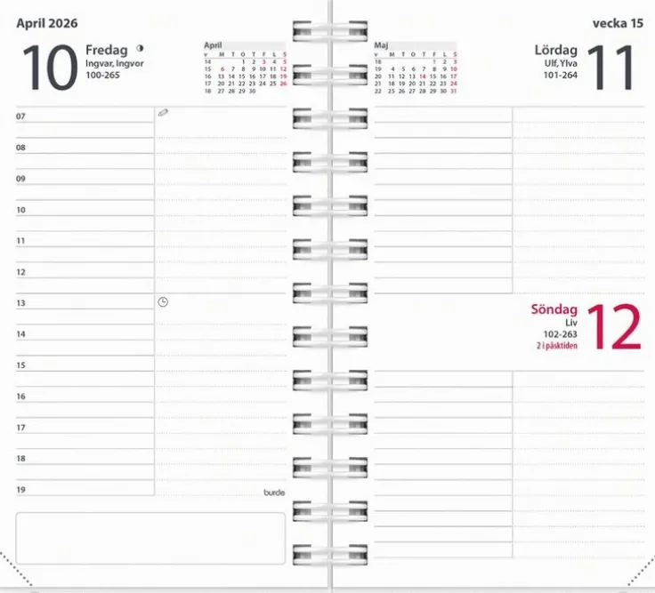 Framsidan kan du ändra året om, kalendern innehåller fyra motiv som du lätt kan byta mellan eller varför inte skapa ett eget? För att detta ska vara möjligt och fortsatt vara ett praktiskt omslag så är omslaget gjort i plast. Agendan har en dag per sida med timindelning 7-19. Kalendern har ett mindre format och tar inte så mycket plats.>Kalender 2026 från Burde. Format: 95×170 mm. Layout: Dag/sida. Timindelning 7-19. Kalendarium: 2025-12-22 – 2027-01-03. Omslag: PP-plast. Spiralbunden. Detaljer: Gummiband. Innehåll: Kyrkliga helgdagar, flaggdagar, helgdagar/aftnar, månfaser, namnsdagar, internationella helgdagar översikt, temadagar/händelser, årsöversikt/årsöversikter, årsplan/årsplaner,. Antal sidor: 352. Miljöinformation: FSC®.