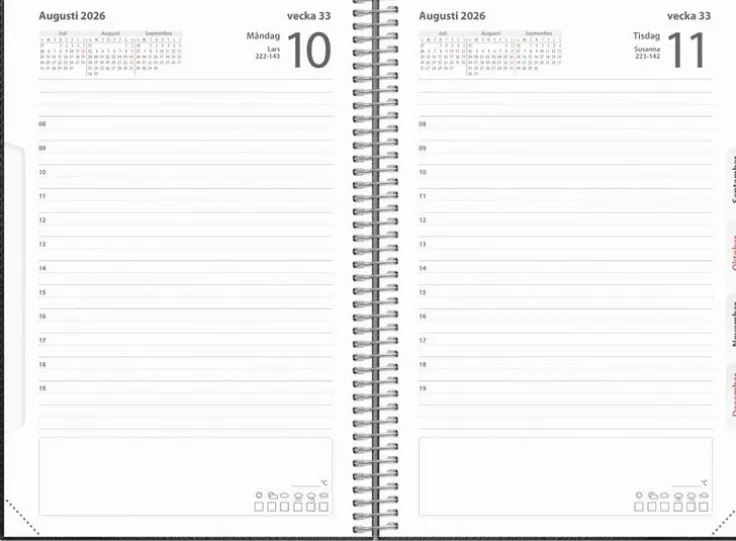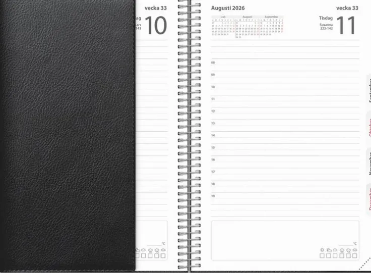Kalender med mjuk pärm i konstläder med den populära flärpen som kan användas som bokmärke. Burdes Dagbok har en dag per sida med timindelning 08-19 vilket gör att den passar både för detaljerad planering och dagboksanteckningar. Genom att sortera dina tankar kan du lära dig mer om dig själv, få enklare att hitta lösningar på problem och dessutom bättra på minnet.>Kalender 2026 från Burde. Format: 135×205 mm. Layout: Dag/sida. Timindelning 8-19. Kalendarium: 2026-01-01 – 2026-12-31. Omslag: Konstläder. Spiralbunden. Innehåll: Kyrkliga helgdagar, flaggdagar, helgdagar/aftnar, månfaser, namnsdagar, internationella helgdagar översikt, temadagar/händelser, årsöversikt/årsöversikter, årsplan/årsplaner, urstansat månadsregister. Antal sidor: 400. Miljöinformation: FSC® papper.