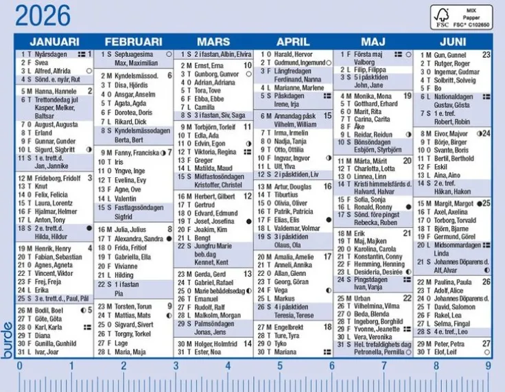 Kalender 2026 från Burde. Format: 100×77 mm. Layout: År/blad. Kalendarium: 2026-01-01 – 2026-12-31. Innehåll: Kyrkliga helgdagar, flaggdagar, helgdagar, månfaser, namnsdagar, årsöversikt,. Antal sidor: 2. Miljöinformation: FSC®.