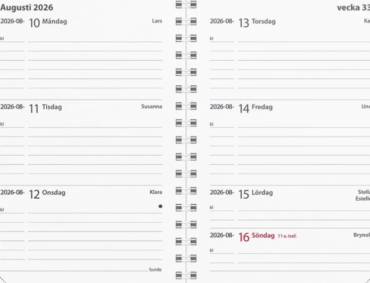 Kalender 2026 från Burde. Format: 83×127 mm. Layout: Liggande. Vecka/uppslag. Kalendarium: 2025-12-15 – 2027-01-03. Omslag: Kartong. Spiralbunden. Innehåll: Kyrkliga helgdagar, flaggdagar, helgdagar/aftnar, månfaser, namnsdagar, internationella helgdagar översikt, temadagar/händelser, årsöversikt/årsöversikter, årsplan/årsplaner, atlas. Antal sidor: 152. Miljöinformation: FSC®.