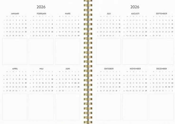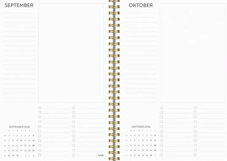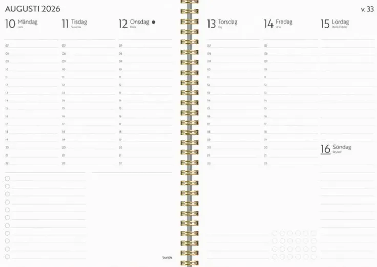 Stilren kalender som har det som behövs för att planera veckan och få ordning på vardagslivet. Tydliga klockslag, 7-22, gör att du lätt kan planera in rätt tider för aktiviteter och kom ihåg. Kalendern är neutral i svartvita färger.>Kalender 2026 från Burde. Format: A5. Layout: Stående. Vecka/uppslag. Timindelning 7-22. Kalendarium: 2025-12-15 – 2027-01-03. Omslag: Kartong med struktur. Spiralbunden. Detaljer: Gummiband. Flyttbara plastmarkörer. Pappersficka. Innehåll: Flaggdagar, helgdagar/aftnar, månfaser, namnsdagar, temadagar/händelser, årsöversikt/årsöversikter, årsplan/årsplaner, anteckningssidor. Antal sidor: 160. Miljöinformation: FSC®.