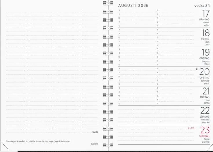Kalender 2026 från Burde. Format: A6. Layout: Liggande. Vecka/uppslag. Timindelning 8-17. Kalendarium: 2025-12-08 – 2027-01-03. Omslag: Plast. Spiralbunden. Innehåll: Kyrkliga helgdagar, flaggdagar, helgdagar/aftnar, månfaser, namnsdagar, internationella helgdagar översikt, temadagar/händelser, årsöversikt/årsöversikter, årsplan/årsplaner, linjerade vänstersidor, löst telefonregister. Antal sidor: 144. Miljöinformation: FSC®.