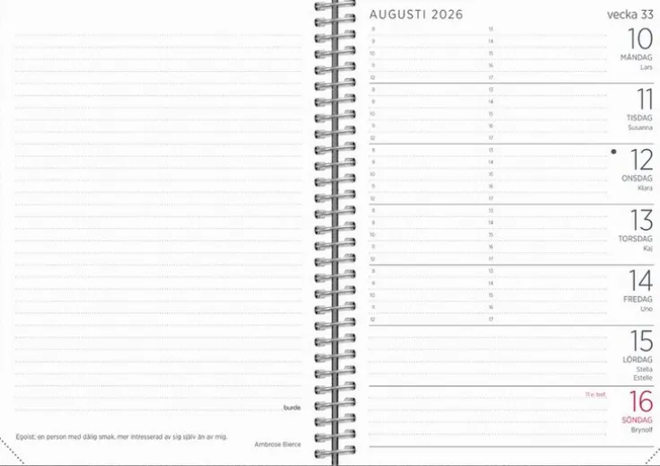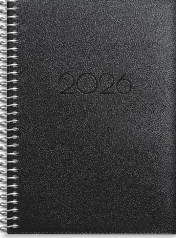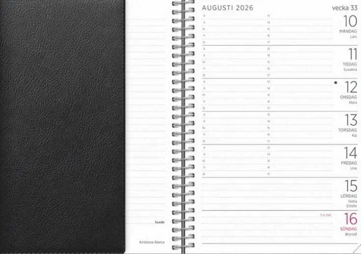 Kalender med mjuk pärm i konstläder med den populära flärpen som kan användas som bokmärke. Inlagan har ett praktiskt uppslag där högersidan har veckoplanering med liggande layout och timindelning 08-17 och vänstersidan är linjerad för anteckningar.>Kalender 2026 från Burde. Format: A6. Layout: Liggande. Vecka/uppslag. Timindelning 8-17. Kalendarium: 2025-12-08 – 2027-01-03. Omslag: Konstläder. Spiralbunden. Innehåll: Kyrkliga helgdagar, flaggdagar, helgdagar/aftnar, månfaser, namnsdagar, internationella helgdagar översikt, temadagar/händelser, årsöversikt/årsöversikter, årsplan/årsplaner, linjerade vänstersidor, anteckningssidor rutiga, anteckningssidor linjerade, anteckningssidor olinjerade. Antal sidor: 128. Miljöinformation: FSC® papper.