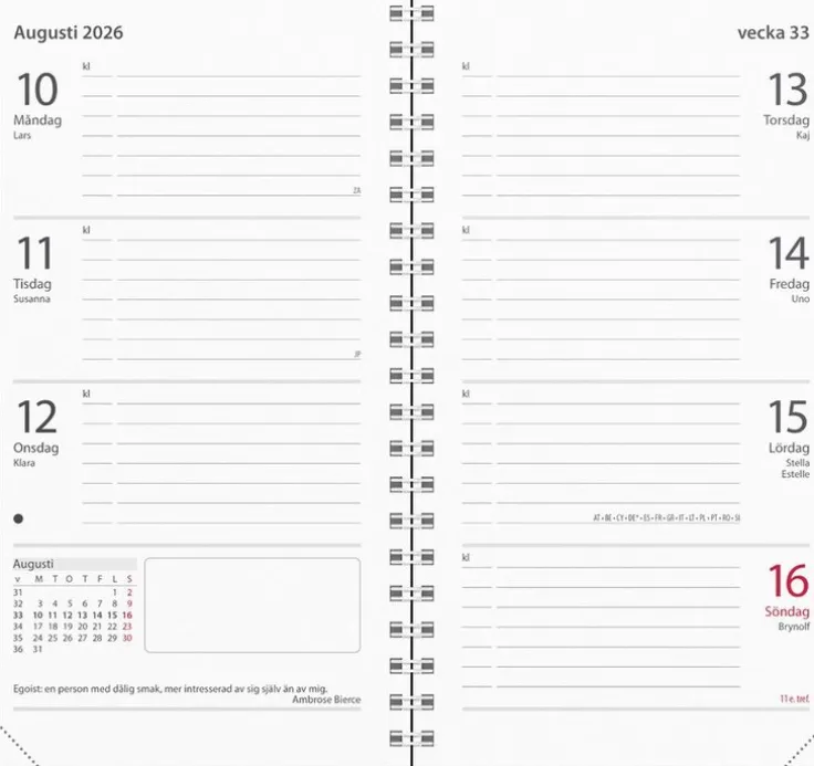 Kalender 2026 från Burde. Format: 83×158 mm. Layout: Liggande. Vecka/uppslag. Kalendarium: 2025-12-08 – 2027-01-03. Omslag: Plast. Spiralbunden. Innehåll: Kyrkliga helgdagar, flaggdagar, helgdagar/aftnar, internationella helgdagar, månfaser, namnsdagar, internationella helgdagar översikt, temadagar/händelser, årsöversikt/årsöversikter, årsplan/årsplaner, telefonregister. Antal sidor: 128. Miljöinformation: FSC®.