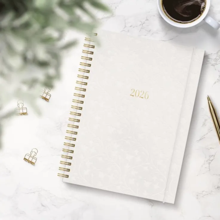 Kalender med en vacker, vit framsida med ett effektfullt präglat mönster. Kalendern har ett uppslag med liggande layout där fokus ligger på tydlig veckoplanering. Inlagans layout passar dig som har mycket på gång, oavsett veckodag. Kalendern är enkel och tydlig med lika mycket utrymme för både vardag och helg.>Kalender 2026 från Burde. Format: A5. Layout: Liggande. Vecka/uppslag. Kalendarium: 2025-12-08 – 2027-01-03. Omslag: Kartong. Spiralbunden. Detaljer: Gummiband. Pappersficka. Innehåll: Kyrkliga helgdagar, flaggdagar, helgdagar/aftnar, månadsöversikter, månfaser, namnsdagar, temadagar/händelser, årsöversikt/årsöversikter, årsplan/årsplaner,. Antal sidor: 144. Miljöinformation: FSC®.