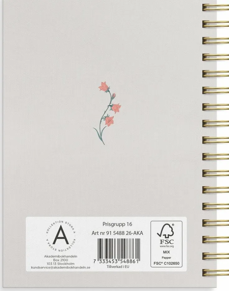 Kalender 2026 som har söta blommor och gulddetaljer på omslaget. Format: A6. Layout: Liggande. Vecka/uppslag. Kalendarium: 2025-12-08 – 2027-01-03. Omslag: Kartong med struktur. Spiralbunden. Antal sidor: 144. Miljöinformation: FSC®.