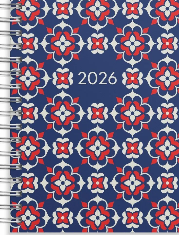 Kalender 2026 med ett grafiskt blommönster. Format: A6. Layout: Liggande. Vecka/uppslag. Kalendarium: 2025-12-08 – 2027-01-03. Omslag: Kartong. Spiralbunden. Antal sidor: 144. Miljöinformation: FSC®.