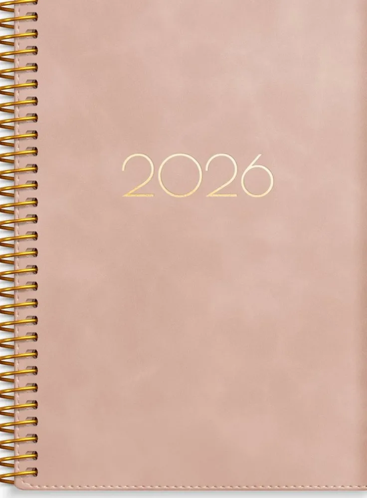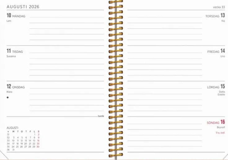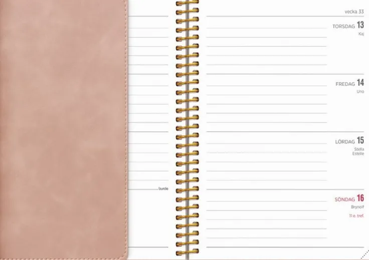Kalender med mjuk pärm i konstläder med den populära flärpen som kan användas som bokmärke. Ett klassiskt uppslag med liggande layout där fokus ligger på tydlig veckoplanering. Inlagans layout passar dig som har mycket på gång, oavsett veckodag. Kalendern är liten och enkel och med lika mycket utrymme för både vardag och helg.>Kalender 2026 från Burde. Format: A6. Layout: Liggande. Vecka/uppslag. Kalendarium: 2025-12-08 – 2027-01-03. Omslag: Konstläder. Spiralbunden. Innehåll: Kyrkliga helgdagar, flaggdagar, helgdagar/aftnar, månfaser, namnsdagar, temadagar/händelser, årsöversikt/årsöversikter, årsplan/årsplaner,. Antal sidor: 144. Miljöinformation: FSC® papper.