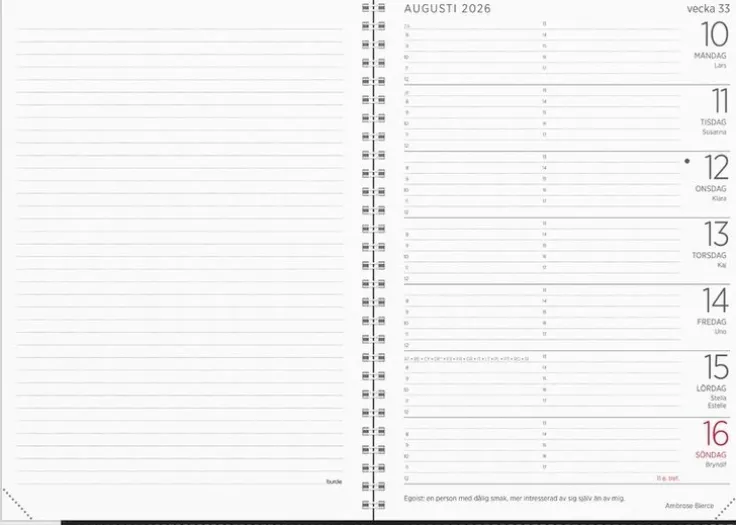 Kalender 2026 från Burde. Format: A5. Layout: Liggande. Vecka/uppslag. Timindelning 8-17. Kalendarium: 2025-12-22 – 2027-01-03. Omslag: Plast. Spiralbunden. Innehåll: Kyrkliga helgdagar, flaggdagar, helgdagar/aftnar, internationella helgdagar, månfaser, namnsdagar, internationella helgdagar översikt, temadagar/händelser, årsöversikt/årsöversikter, årsplan/årsplaner, linjerade vänstersidor, löst telefonblad. Antal sidor: 112. Miljöinformation: FSC®.