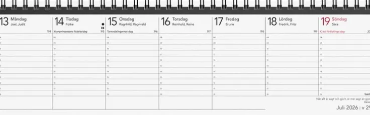 Kalender 2026 från Burde. Format: 305×90 mm. Layout: Stående. Vecka/uppslag. Timindelning 8-18. Kalendarium: 2025-12-15 – 2027-01-03. Omslag: Kartong. Spiralbunden. Innehåll: Kyrkliga helgdagar, flaggdagar, helgdagar/aftnar, månfaser, namnsdagar, temadagar/händelser, årsöversikt/årsöversikter,. Antal sidor: 112. Miljöinformation: FSC®.