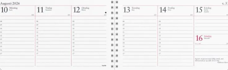 Kalender 2026 från Burde. Format: 148×90 mm. Layout: Stående. Vecka/uppslag. Timindelning 8-17. Kalendarium: 2025-12-15 – 2027-01-03. Omslag: Kartong. Spiralbunden. Innehåll: Kyrkliga helgdagar, flaggdagar, helgdagar/aftnar, månfaser, namnsdagar, internationella helgdagar översikt, temadagar/händelser, årsöversikt/årsöversikter, årsplan/årsplaner,. Antal sidor: 128. Miljöinformation: FSC®.