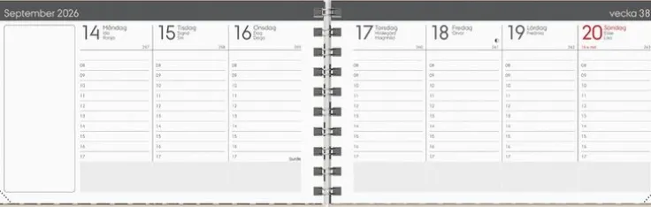 Kalender 2026 från Burde. Format: 148×90 mm. Layout: Stående. Vecka/uppslag. Timindelning 8-17. Kalendarium: 2025-12-15 – 2027-01-03. Omslag: Kartong med struktur. Spiralbunden. Innehåll: Kyrkliga helgdagar, flaggdagar, helgdagar/aftnar, månfaser, namnsdagar, internationella helgdagar översikt, temadagar/händelser, årsplan/årsplaner, telefonregister. Antal sidor: 144. Miljöinformation: FSC®.