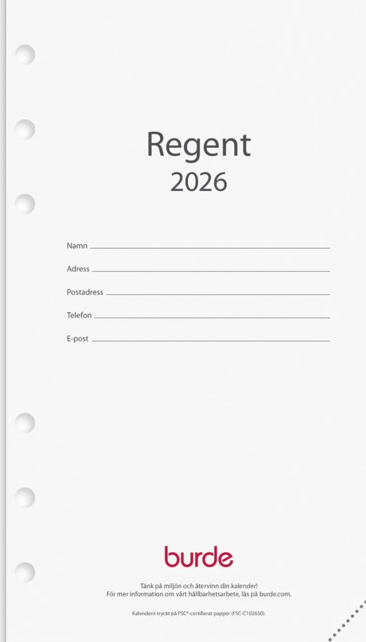 Hålad kalenderrefill till systemkalender med ringmekanism.>Kalender 2026 från Burde. Format: 95×170 mm. Layout: Liggande. Vecka/uppslag. Timindelning 8-17. Kalendarium: 2025-10-27 – 2027-01-24. Omslag: Kartong. Innehåll: Kyrkliga helgdagar, flaggdagar, helgdagar/aftnar, månfaser, namnsdagar, internationella helgdagar översikt, temadagar/händelser, årsöversikt/årsöversikter, årsplan/årsplaner,. Antal sidor: 128. Miljöinformation: FSC®.
