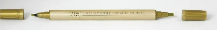 Kalligrafipenna ZIG Metallic MS-8400 guld med dubbla spetser 2 och 3,5 mm. Vattenbaserat pigmentbläck som står emot ”tidens tand” och är fotosäkert, syrafritt, arkivbeständigt, ljusäkta och vattenfast efter torkning. Xylen- och luktfritt.