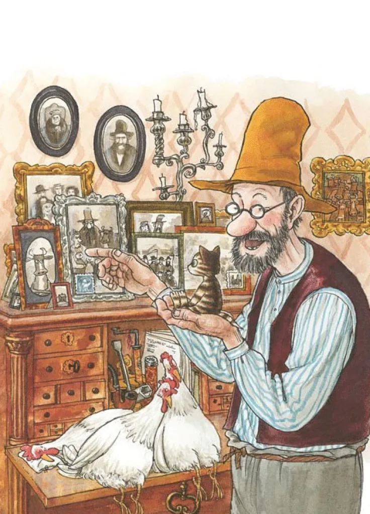 Pettson och Findus tittar på porträtt av Sven Nordqvist.