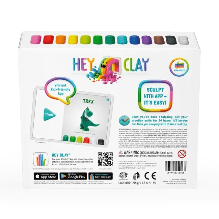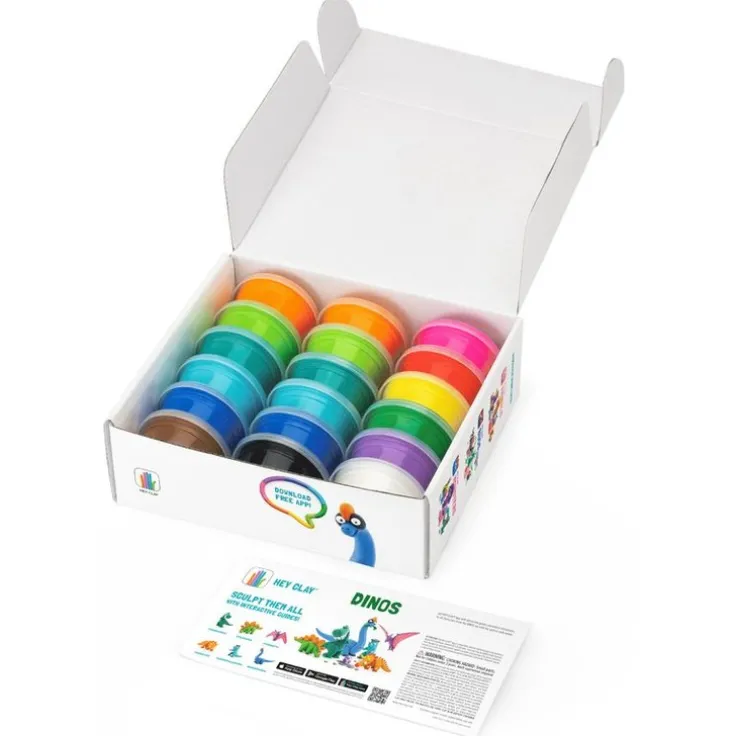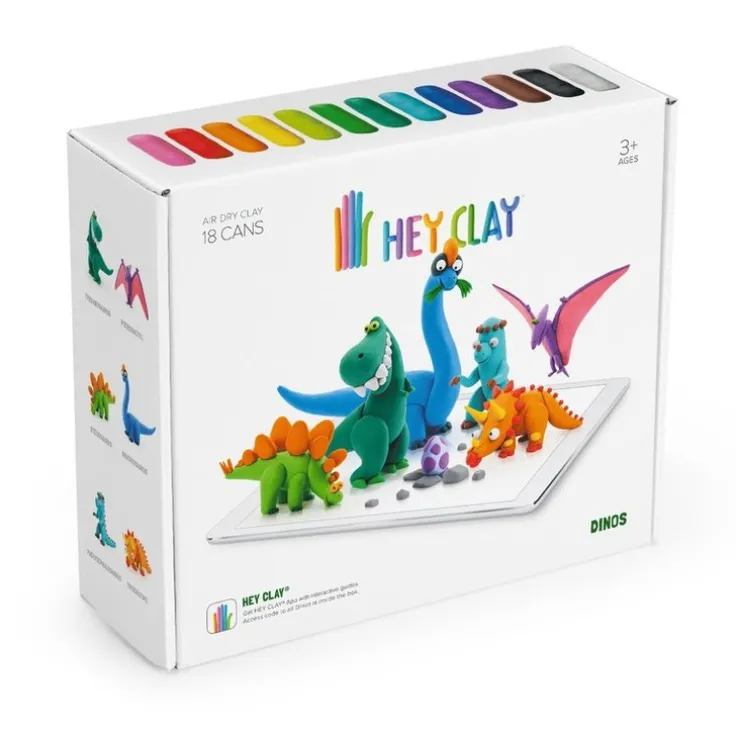 Ett riktigt kul och kreativt set med lufttorkande lera att skapa 6 olika dinosaurier av, som du sen kan leka med. Detta set innehåller material för att kunna skapa: en pachycephalosaurus, en stegosaurus, en brachiosaurus, en flygödla, en T-rex och en triceratops. Setet innehåller 18 burkar lätt, mjuk, elastisk och lufttorkande lera i klara livfulla färger som går att blanda ihop till nya nyanser och du kan få hjälp i skapandet av en gratis barnvänlig app med interaktiva video-guider som har enkla steg-för-steg instruktioner (på engelska) för hur man skulpterar många olika karaktärer. Du låser upp beskrivningarna för setets alla karaktärer med en kod som finns inuti paketet. Låt figurerna lufttorka i 24 timmar så kan du sen leka med dem precis som en leksak eller dela bilder på dina skapelser med dina vänner. När du har fått kläm på de enkla grundläggande teknikerna får du säkert inspiration till att skapa dina helt egna figurer eller scener. Förvara den lera som inte används i lufttäta förpackningar så torkar den inte ut. Innehåll: 18 burkar lufttorkande lera (totalt ca 275 g lera i 13 färger) samt ett informationsblad med bilder på alla dinosaurierna, en länk till där ni kan hämta appen och koden som låser upp appens guider för hur man skapar alla dinosaurierna i setet.