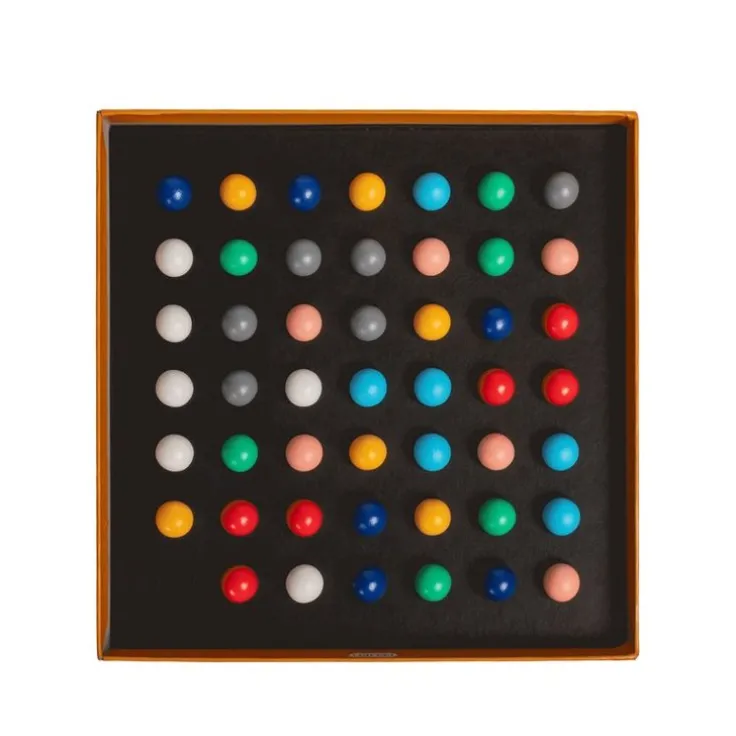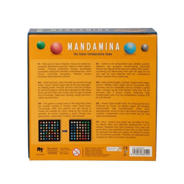 Detta är ett extraordinärt spel, alldeles ljudlöst. Spelarna ska gruppera slumpmässigt placerade träkulor per färg på så få drag som möjligt. Man spelar i turordning och tillsammans men utan att säga ett ord och utan att med säkerhet veta hur medspelarna tänker. Tystnad. Fokus. Spänning. Tillverkat i Finland. Regler på svenska, finska, danska, norska, franska, tyska och engelska. 1-4 spelare, 10 min, 8+