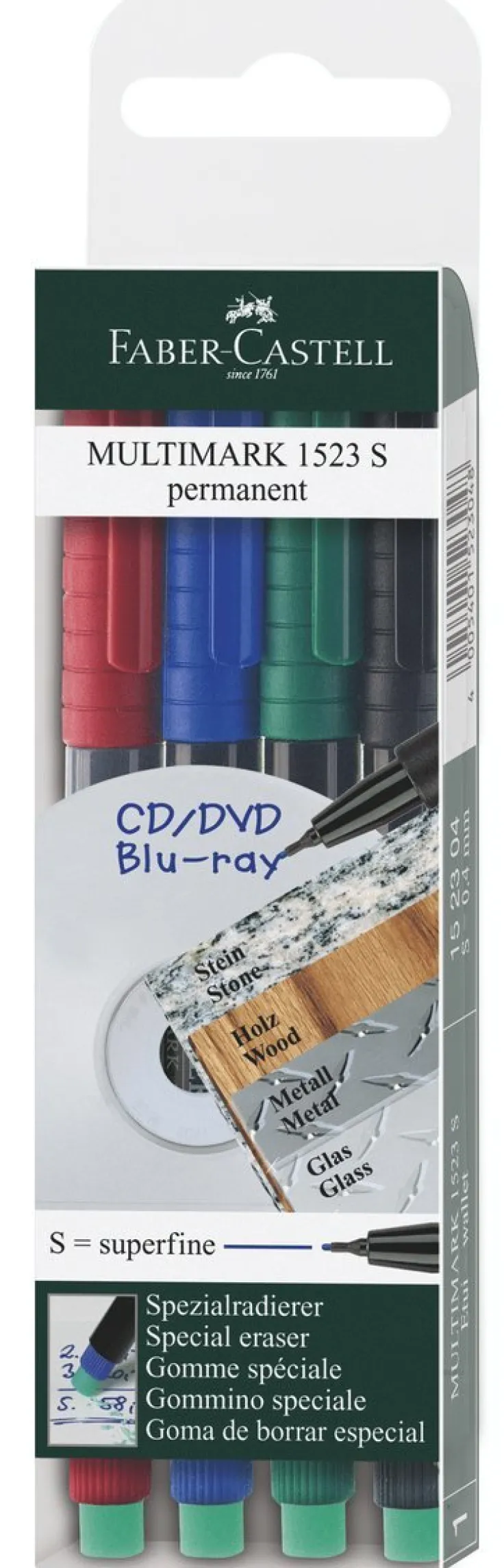 Märkpenna Multimark för permanent märkning på hårda släta ytor, ljusäkta, super fine spets 0,4 mm, etui med 4 basfärger. 100% återvunnen plast.
